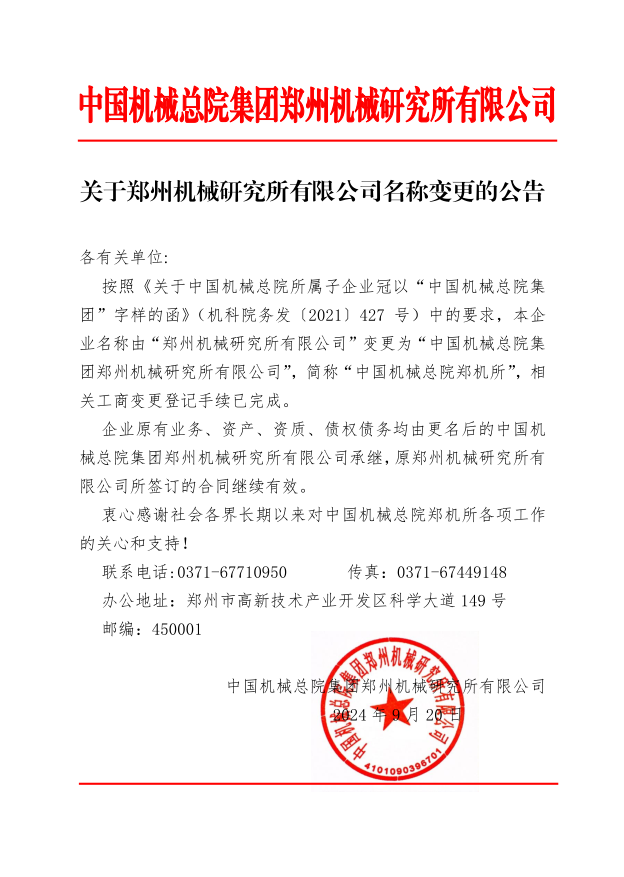 關(guān)于鄭州機械研究所有限公司名稱(chēng)變更的公告